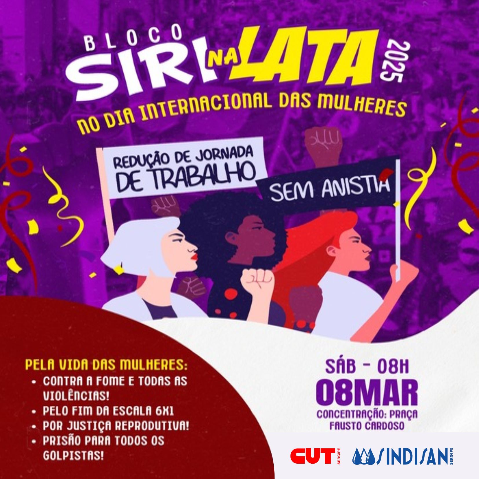 Sendo assim, em 2025, o Siri na Lata estará sob o comando das mulheres empoderadas da classe trabalhadora de Sergipe, que vão ocupar as ruas do Centro de Aracaju na luta ‘Pela vida das mulheres: contra a fome e todas as violências; pelo fim da escala 6×1; por justiça reprodutiva e pela prisão para todos os golpistas!’.